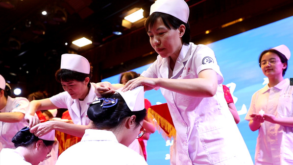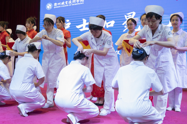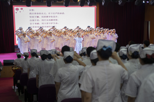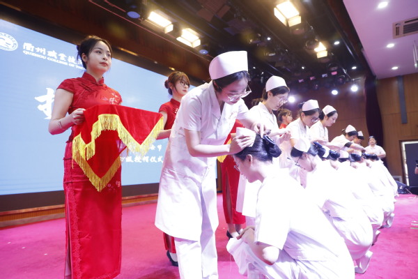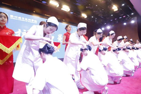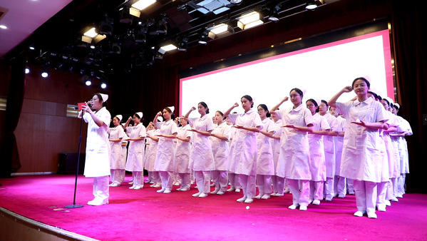 “终身纯洁,忠贞职守。勿为有损之事,提高护理之标准,慎守病人家务及秘密。竭诚协助医生之诊治,务谋病者之福利。”“人道、博爱、奉献”的南丁格尔精神也一直闪烁着高贵的灵魂光芒,护理前辈们为同学们加冕授帽。授帽仪式是护生成为护士的重要时刻,在护理学创始人南丁格尔像前,市人民医院、市中医医院护理部医生及我校的老师们为21级护生戴上象征着圣洁的天使的洁白燕帽,护生接过前辈手中象征着“燃烧自己,照亮他人”的蜡烛,站在南丁格尔像前宣读誓言。