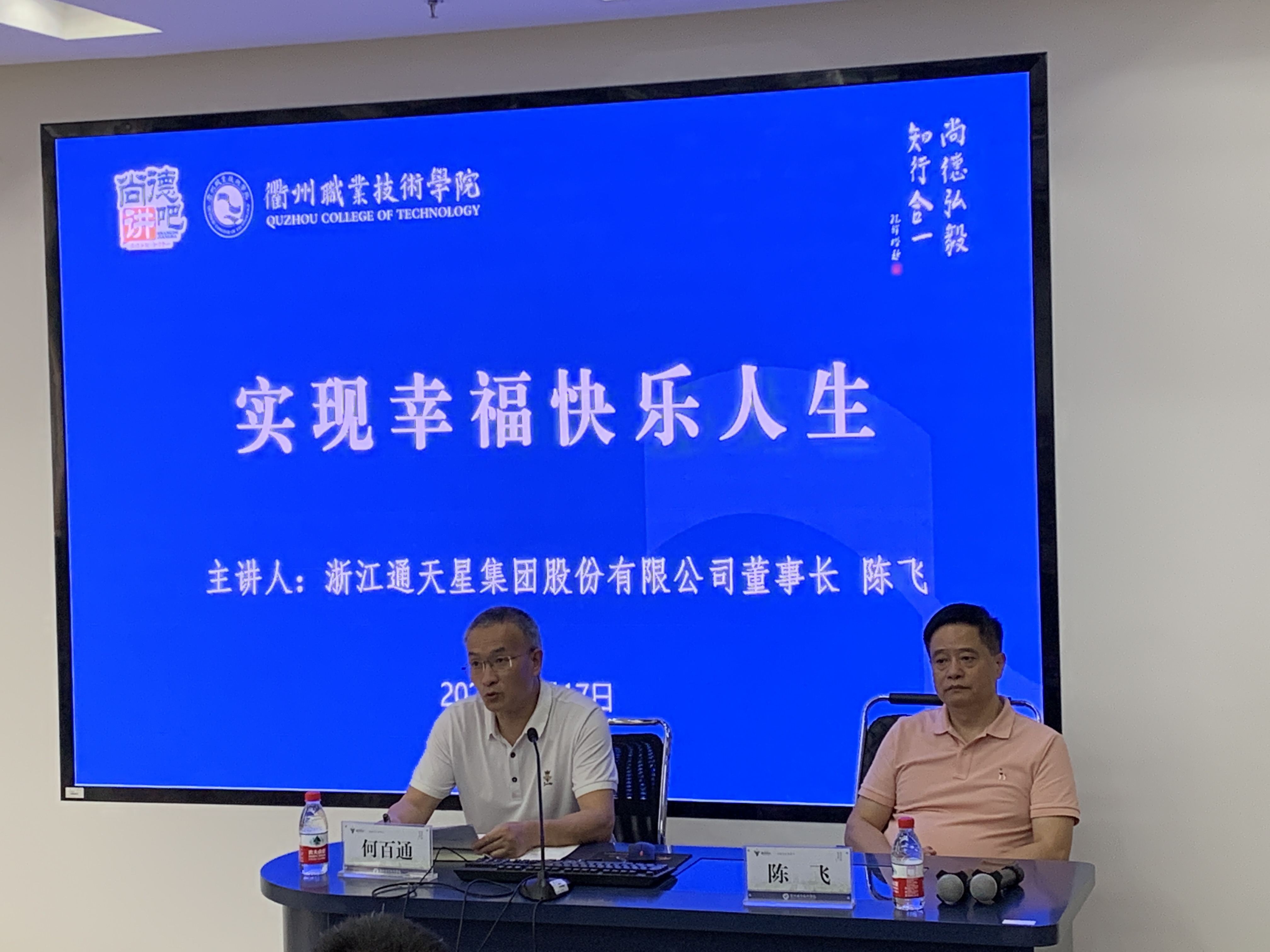 5月17日,我校“尚德讲吧”邀请浙江通天星集团股份有限公司董事长陈飞作“实现幸福快乐人生”主题讲座,校党委副书记何百通主持讲座。