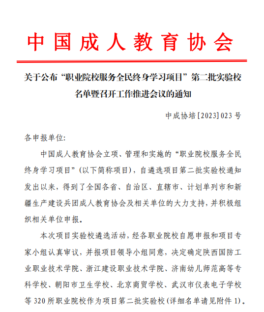 近日,中国成人教育协会公布了“职业院校服务全民终身学习项目”第二批实验校名单(中成协培【2023】023号),由我校申报的《打造四省边际(衢州)共富学院 助力“三新”人群提技致富》项目名列其中,本次共确定320所职业院校作为第二批实验校,其中高职院校共167所。
