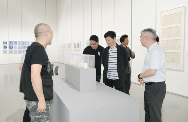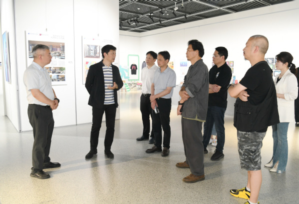 在一件件摄影、设计、综合装置等作品前,李舸不时驻足欣赏,并与艺术设计学院院长叶云龙、党总支书记戚景云、副院长潘宇等现场交流。