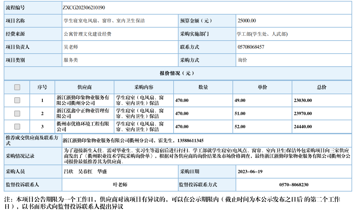 开元网页版学生寝室电风扇、窗帘、室内卫生保洁自行采购信息公示