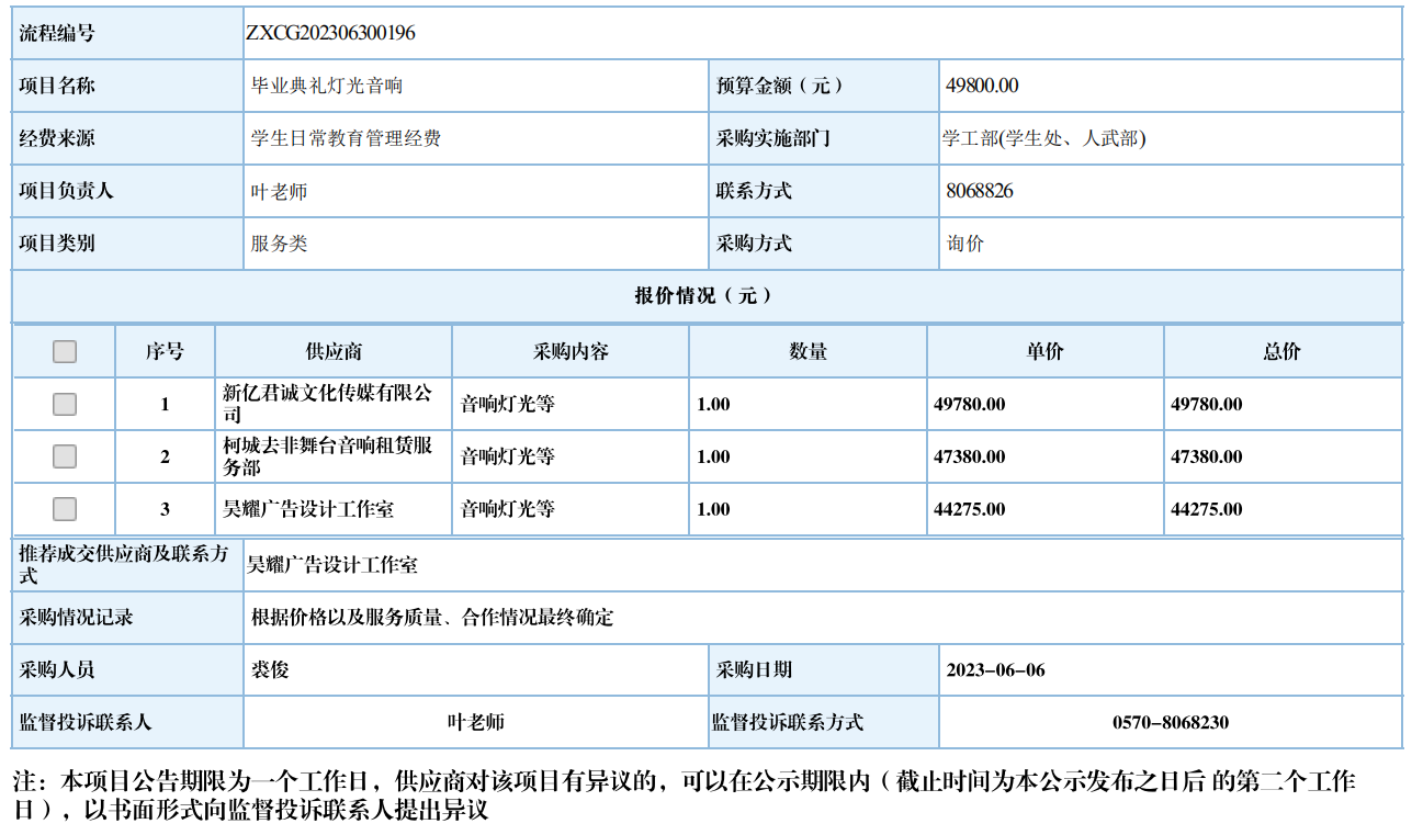 开元网页版毕业典礼灯光音响自行采购信息公示