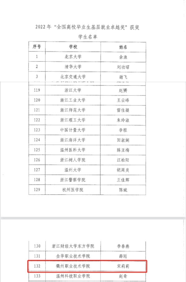 近日,由教育部高校学生司、教育部学生服务与素质发展中心共同指导评选,中国教育发展基金会设立的2022年度“全国高校毕业生基层就业卓越奖”名单公布,我校2014届毕业生——留衢就业典型宋莉莉成功入选。