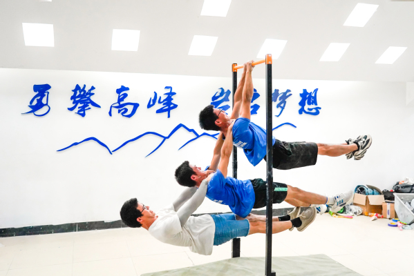 “脚再用点力,胆子大一点,左手再往上伸一伸。”在教练彭元的指导下,攀岩队员张春敏不断调整攀爬路线与角度。三趟15米高的难度赛岩壁攀爬结束回到地面,张春敏虽已满头大汗,但她的眼中依旧充满了热情和坚韧。