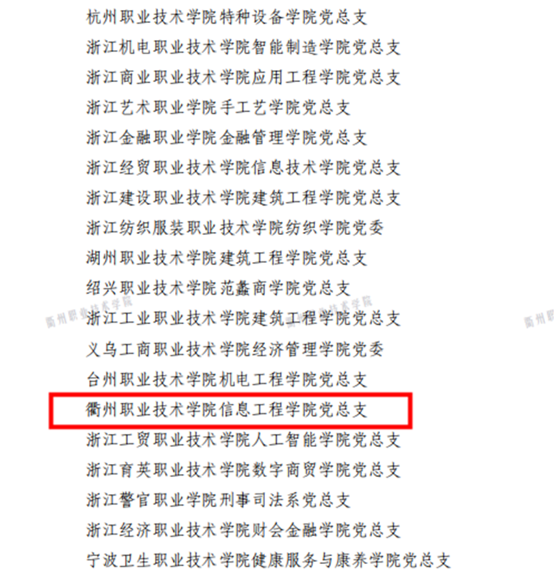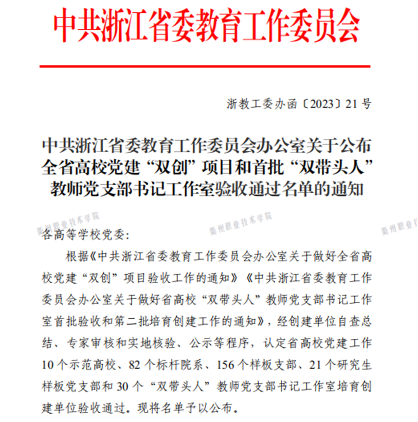 近日,中共浙江省委教育工作委员会办公室公布全省高校党建“双创”项目和首批“双带头人”教师党支部书记工作室验收通过名单,我校信息工程学院党总支顺利通过第二批“全省高校党建工作标杆院系”验收!