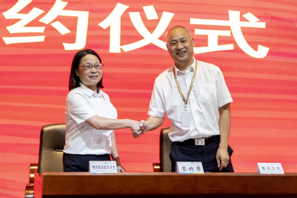 衢职院医学院院长邱惠萍与衢州二院党委委员林惠洪共同签署“双师型”教师培养培训与企业实践基地合作协议。