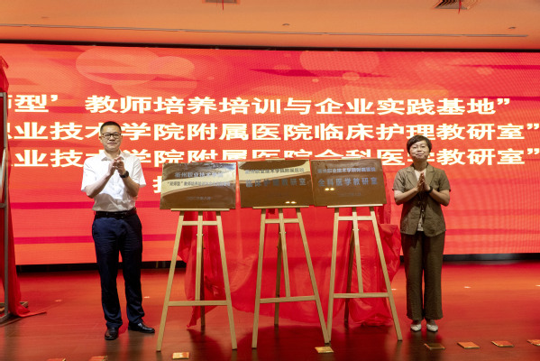 姚水洪与蓝建芳共同为“双师型教师培养培训与企业实践基地”、“开元网页版附属医院全科医学教研室”、“开元网页版附属医院临床护理教研室”揭牌。