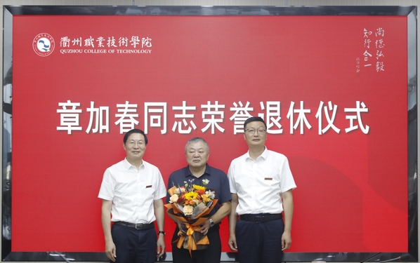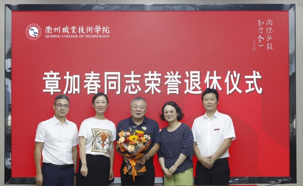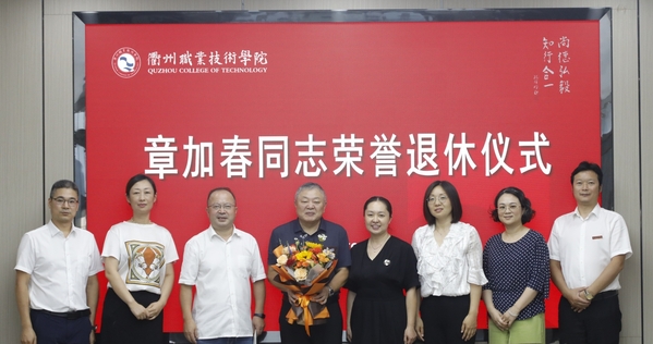 徐须实代表校党委向章加春同志光荣退休表示热烈祝贺,对章加春同志多年来为学校发展作出的贡献表示感谢,并表达了对他的真诚敬意和美好祝福。他赞扬章加春同志讲政治、顾大局,定位准、做事实,讲纪律、守规矩,为人、做事的良好风范,将留存在每个与其共事过的衢职人记忆中,记载在学校的发展历程之中。他希望章加春同志退休后保重身体、快乐生活,坚持锻炼、放松心态,快乐开启第二春!坚持学习,与时俱进,做一个与时代同步的退休达人。发挥优势,老有所为,继续关心支持学校的建设发展,为学校“双高”建设增添正能量、再作新贡献。