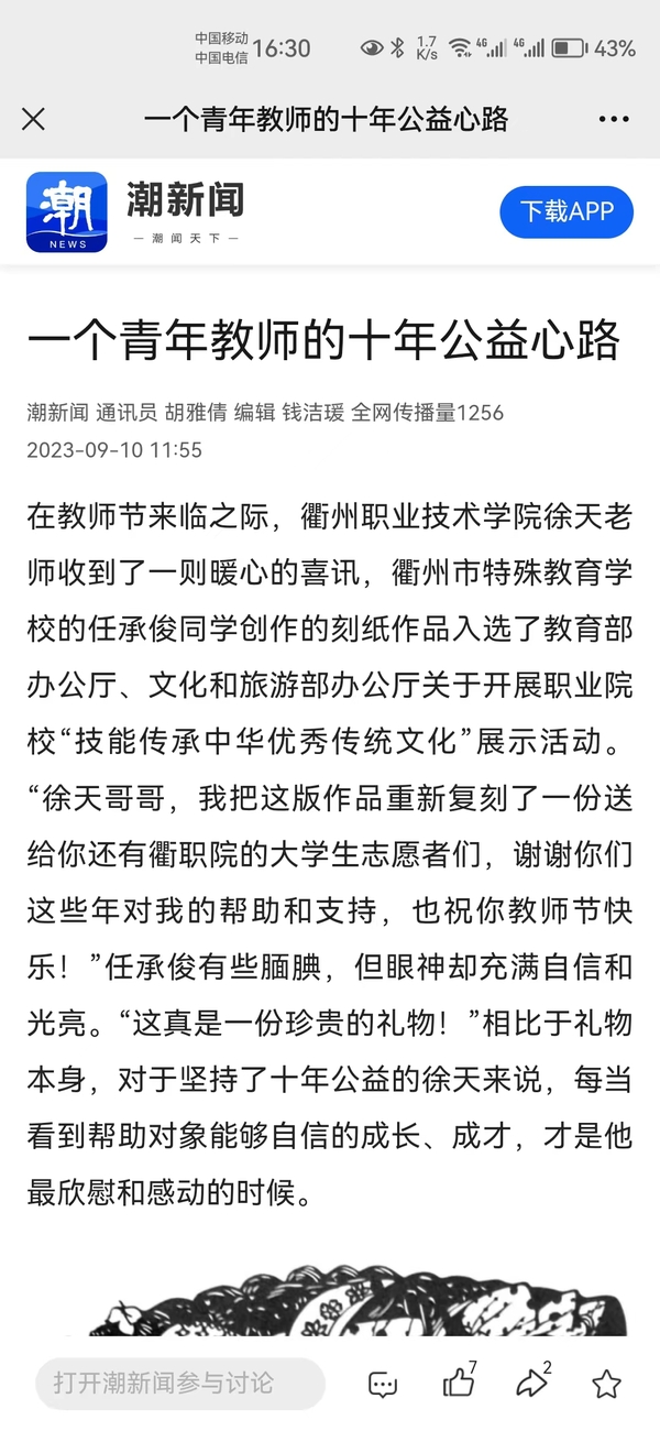在教师节来临之际,开元网页版徐天老师收到了一则暖心的喜讯,衢州市特殊教育学校的任承俊同学创作的刻纸作品入选了教育部办公厅、文化和旅游部办公厅关于开展职业院校“技能传承中华优秀传统文化”展示活动。“徐天哥哥,我把这版作品重新复刻了一份送给你还有衢职院的大学生志愿者们,谢谢你们这些年对我的帮助和支持,也祝你教师节快乐!”任承俊有些腼腆,但眼神却充满自信和光亮。“这真是一份珍贵的礼物!”相比于礼物本身,对于坚持了十年公益的徐天来说,每当看到帮助对象能够自信的成长、成才,才是他最欣慰和感动的时候。