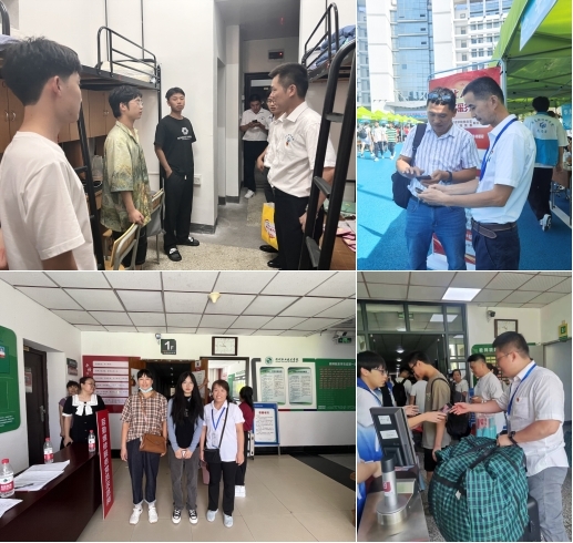 “红色领航”活动中,党员教师积极迎新,帮助新生快速办理入学手续、护送学生入住寝室,走访联系寝室同学,细心解答学生、家长关注的日常生活、学业方面的困惑。