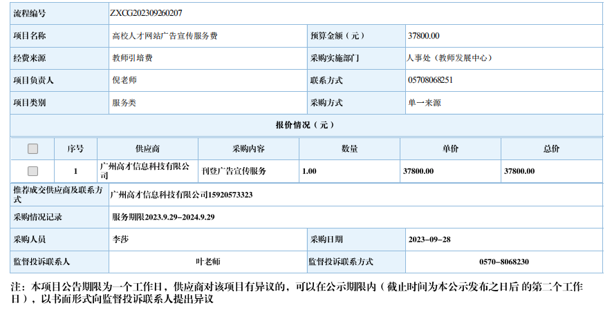开元网页版高校人才网站广告宣传服务费自行采购信息公示