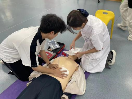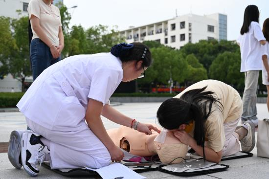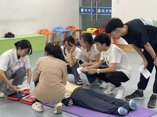 在思齐广场的另一角,志愿者们针对心脏骤停、气道梗阻窒息等突发事件,对同学们进行心肺复苏(CPR)和海姆立克腹部冲击法的一对一教学。为了更好地提高同学们的参与积极性,同时开展了CPR操作计分挑战赛。