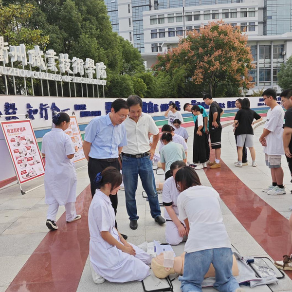 活动现场,校党委书记徐须实与同学们一起体验急救操作。