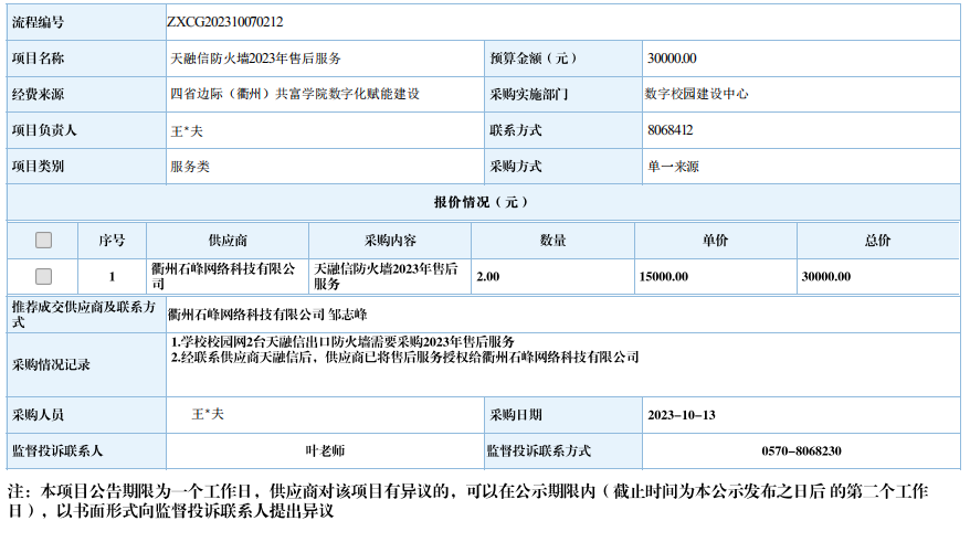 开元网页版天融信防火墙2023年售后服务自行采购信息公示
