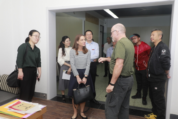 蒲蒞莎一行参观走访了我校数字创意设计实训中心,了解我校参与互派艺术家交流项目的相关情况,看望正在我校进行实地艺术创作和交流的美国雷德温市艺术家马特·奎因 。