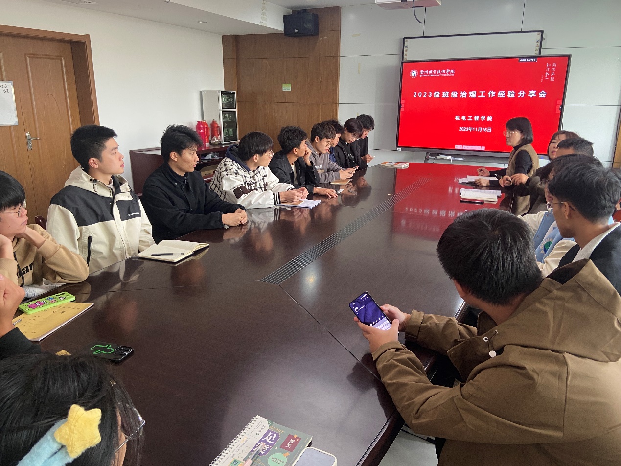 为进一步提升班干部的班级管理水平,促进班级形成良好的班风和学风,更好地推动我院学生工作的顺利开展,11月15日中午,机电工程学院在机电大楼307召开2023级班级治理工作经验分享会。机电工程学院党总支副书记叶云霞老师、学工办主任李芸、辅导员李治丹,全体2023级班长和助理班主任参加会议,会议由李芸主持。