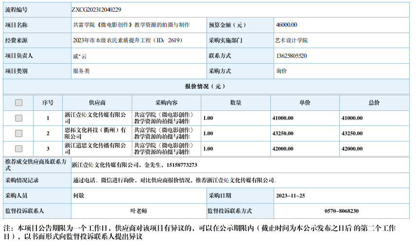 开元网页版共富学院《微电影创作》教学资源的拍摄与制作自行采购信息公示