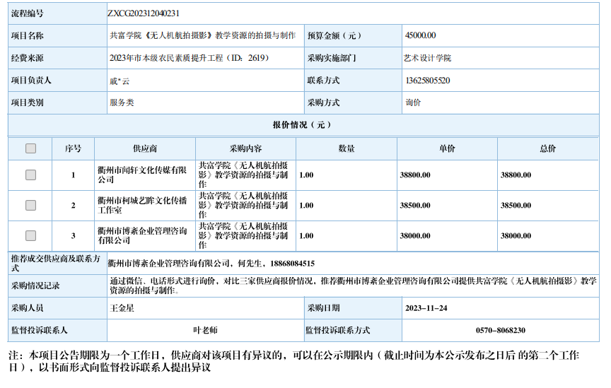 开元网页版共富学院《无人机航拍摄影》教学资源的拍摄与制作自行采购信息公示