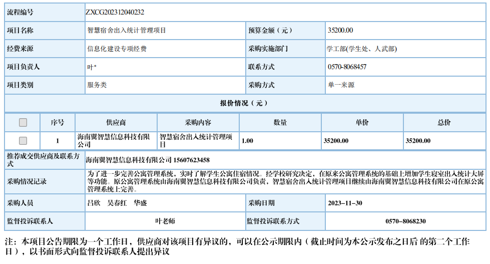 开元网页版智慧宿舍出入统计管理项目自行采购信息公示