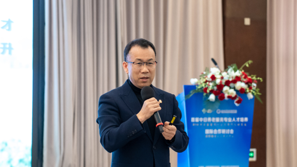 中国教育国际交流协会职业教育重大项目组副组长金雷介绍中日养老服务专业人才培养项目。