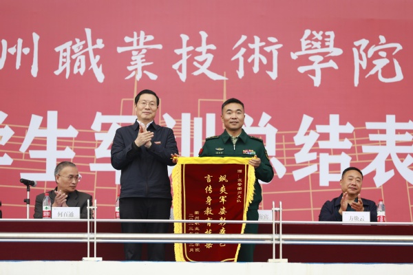姚水洪宣读2023级学生军训工作优胜集体和先进个人名单,校领导和承训部队领导为2023级学生军训工作优胜集体和先进个人颁奖。