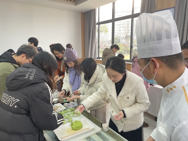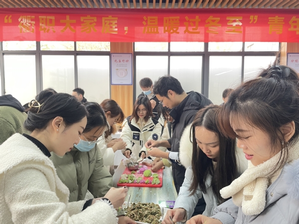 冬至来临,在学校的食堂里,来自各分工会的100多位老师们正热火朝天地进行着一场包饺子活动。他们的脸上洋溢着欢笑,手上动作娴熟,和面、擀皮、放馅、捏边,一气呵成。