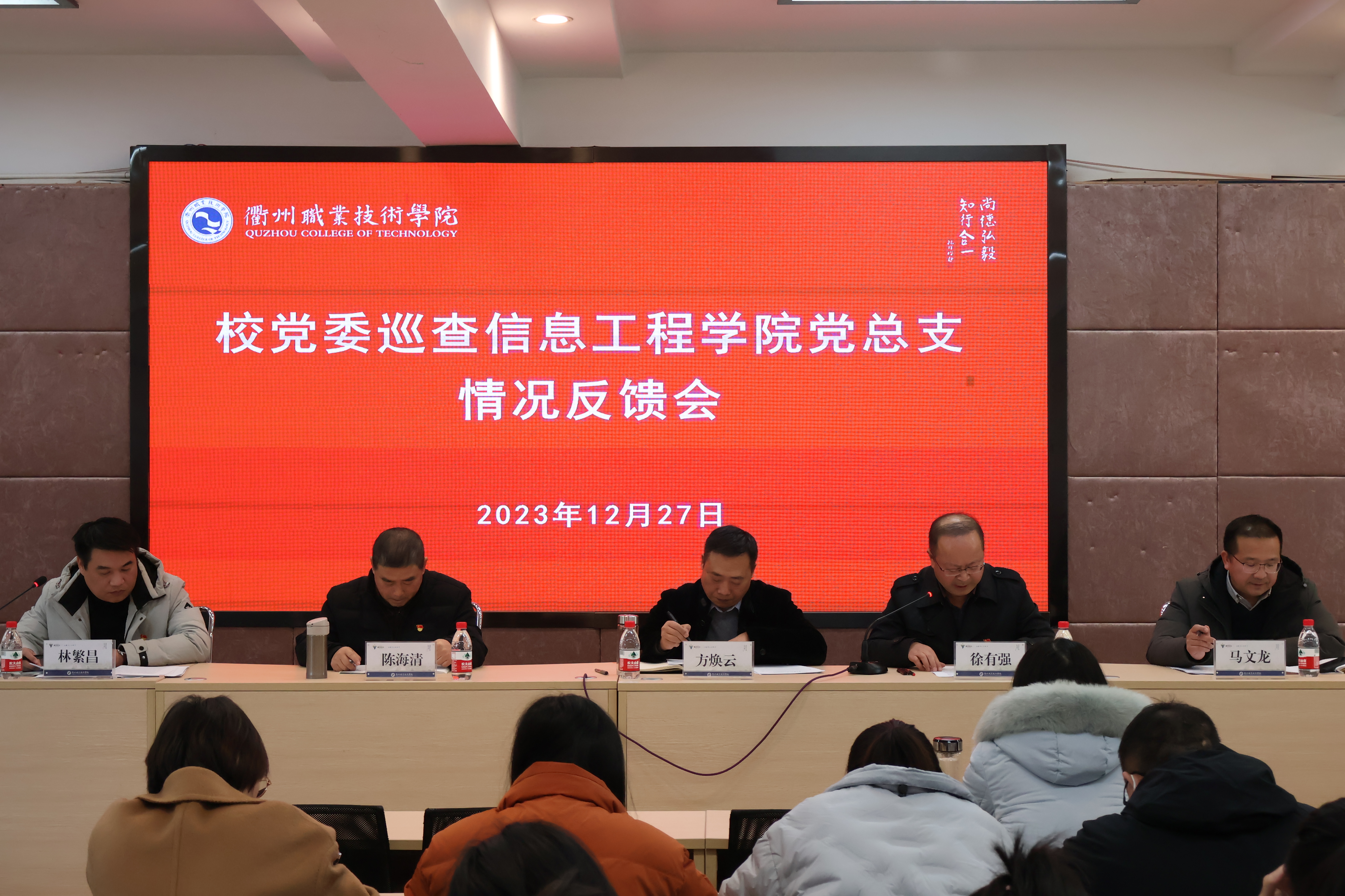 据校党委关于巡查工作的统一部署,12月27日下午校党委巡查组向信息工程学院反馈巡查意见,校党委委员、纪委书记、巡查组组长方焕云,校纪委副书记、纪检室主任、巡查组副组长徐有强,巡查组副组长陈海清出席,巡查组全体成员、各二级学院党总支书记、直属党支部书记、信息工程学院全体在编在岗教职工参加会议,会议由信息工程学院党总支书记林繁昌主持。