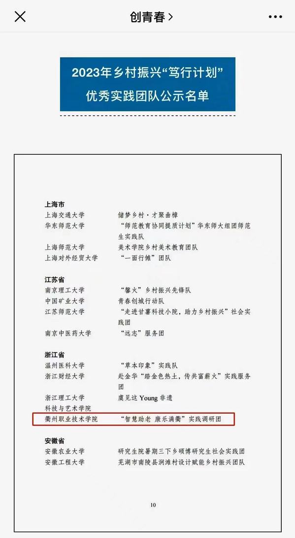 近日,共青团中央发布了2023年乡村振兴”笃行计划”专项行动表扬名单,我校”智慧助老 康乐满衢“实践调研团获评优秀实践团队,全国共95个,浙江共4个团队上榜。