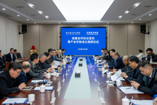 1月18日,衢职院-华夏航空控股战略合作协议签约暨产业学院成立揭牌仪式在我校举行。华夏航空控股(深圳)有限公司总裁张工,华夏航空控股(深圳)有限公司副总裁、华夏蓝翼教育科技(衢州)有限公司董事长吴成富,我校党委书记徐须实,党委副书记、校长吕延文,党委委员、副校长姚水洪参加,签约仪式由校党委副书记何百通主持。