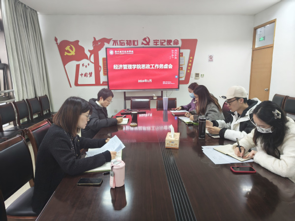 为进一步强化立德树人宗旨,进一步集思广益、凝聚共识,全面总结学院2023年思政工作成效,集中交流2024年思政工作思路,1月20日上午,经济管理学院在729会议室召开思政工作务虚会。学院党总支书记斯彬彬、党总支副书记蒋雪芬,学工办全体辅导员参加。