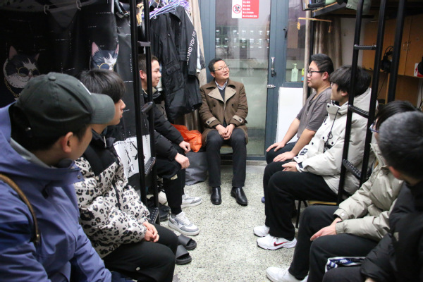 2月26日晚,校党委副书记、校长吕延文走访看望了华友新材料学院联系寝室的同学们,学院党总支副书记吴忠、副书记孔慧兰陪同。全体班主任、辅导员逐间走访了全体华友学子,深入了解同学们新学期学习、生活情况,开展安全隐患排查,督促寝室内务卫生,确保各项学生工作平稳、有序开展。