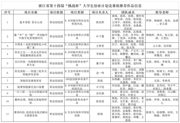 根据浙江省第十四届“挑战杯”大学生创业计划竞赛工作要求,我校组织开展了挑战杯作品申报工作,经各二级学院组织申报、专家综合评审,现将拟推荐省赛作品进行公示。公示时间2024年3月13日-3月15日,共3天,联系电话:8068210。