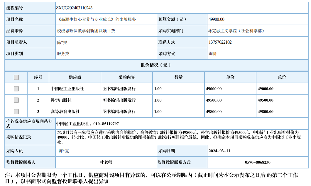开元网页版《高职生核心素养与专业成长》的出版服务自行采购信息公示