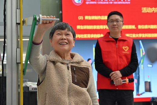 活动第二场,我们向社区居民展示师生研制的家用手臂关节训练智能器械,讲解该器械的设计思想和工作原理,让大家更加了解其背后的科学原理。同时,邀请居民亲自体验并感受器械的使用性,让他们亲身感受到这项科技带来的便利与效果。最后,我们期待并欢迎社区居民提出宝贵的改进建议,以便不断改进和完善这一智能器械,更好地服务社区居民的健康和生活需求。
