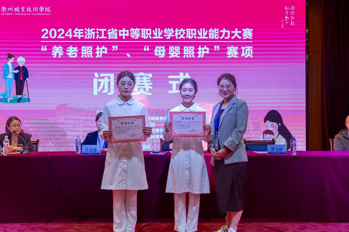 经过一天紧张、激烈的角逐,“养老照护”赛项最终产生了2个一等奖、4个二等奖和5个三等奖;“母婴照护”赛项最终产生了2个一等奖、3个二等奖和5个三等奖,并在闭幕式上进行了颁奖。