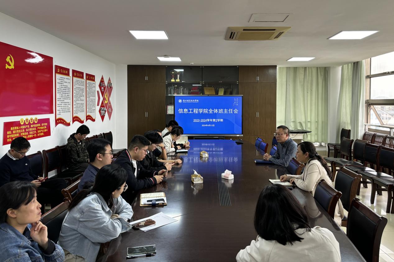 为进一步筑牢学生工作安全底线,信息工程学院开展学生安全专项整治行动。4月12日中午,学院在行政楼724会议室召开全体班主任会议,院党总支书记廖建平主持并讲话,院党总支副书记谷明慧部署具体工作,学院各年级班主任、学工办辅导员参加会议。