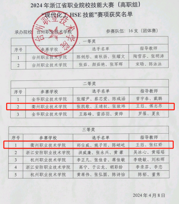 4月3日,2024年浙江省职业院校技能大赛(高职组)“现代化工HSE技能”赛项在台州职业技术学院举行。来自全省8个高职院校的16支代表队48名选手同台竞技,华友新材料学院张凯歌、王靖权、张致玮、郑仕威、姚子雨、陈峭屹6位同学表现优异,凭着扎实的专业素养、过硬的专业技能,沉着应战,取得浙江省二等奖、三等奖的佳绩。