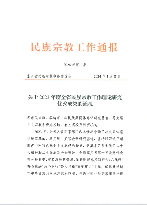 在浙江省民族宗教事务委员会2024年1月通报的2023年度全省民族宗教工作理论研究优秀成果中,我校的理论研究课题《衢州跨区打造民族共富联盟的创新实践——以江山市“1+5”民族共富联盟、开化县联盟矩阵发展新模式为例》荣获全省二等奖。