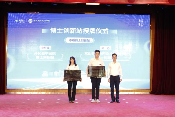 洪龙城为开化县中医院李可峰博士创新站、常山天道中药饮片有限公司吴丹博士创新站授牌。