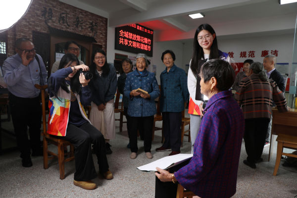 在池淮村文化礼堂,艺术设计学院第二党支部党员师生发挥摄影摄像技术专业、数字媒体技术专业优势,开展“光影助力•温暖记忆”老年人肖像照拍摄、“数字赋能•智慧助老”《老年人新媒介素养提升》教材读本捐赠等志愿服务,把“影棚”搬到了这里,精心为村里的老人们拍摄肖像照,并现场打印装框,连同《老年人新媒介素养提升》教材读本一起送到老人们的手里,帮助老年人融入智慧社会、享受智慧生活。