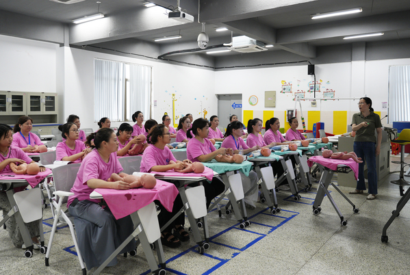 刘明一行先后实地走访了四省边际(衢州)共富学院展厅,医学院母婴护理实训室,并观摩了衢州保姆(月嫂)高级班教学实训。