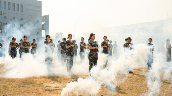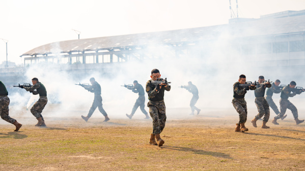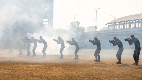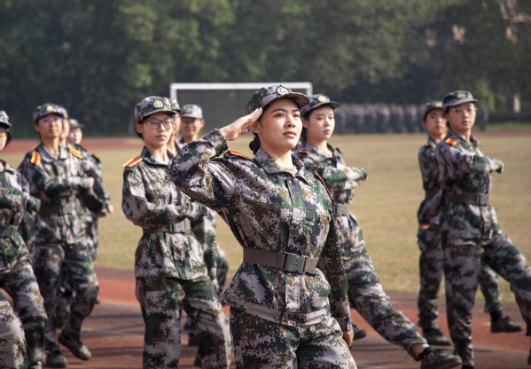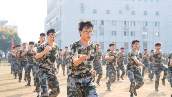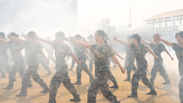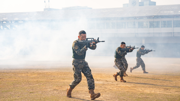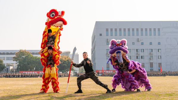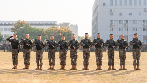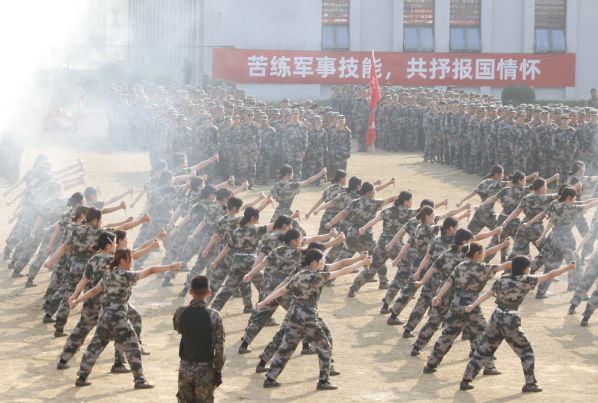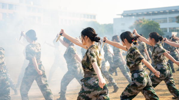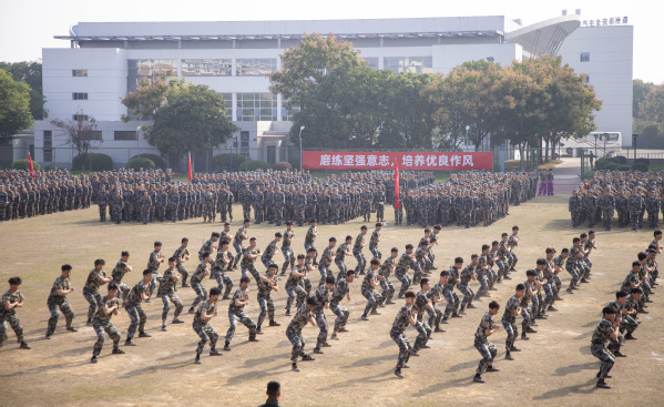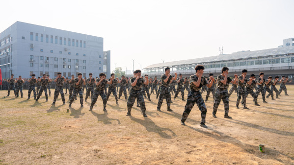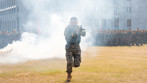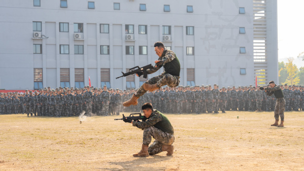 承训教官为全体新生表演了战术、格斗和武术,迅疾的动作尽展飒爽英姿,每一声喊杀都气势磅礴,精彩的表演赢得了现场观众的阵阵掌声和欢呼声。