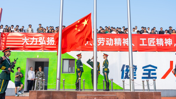 庄严肃穆的升旗仪式拉开了总结表彰大会的序幕,国旗护卫队迈着铿锵有力的步伐行进至国旗台,五星红旗在恢宏大气的国歌声中冉冉升起。