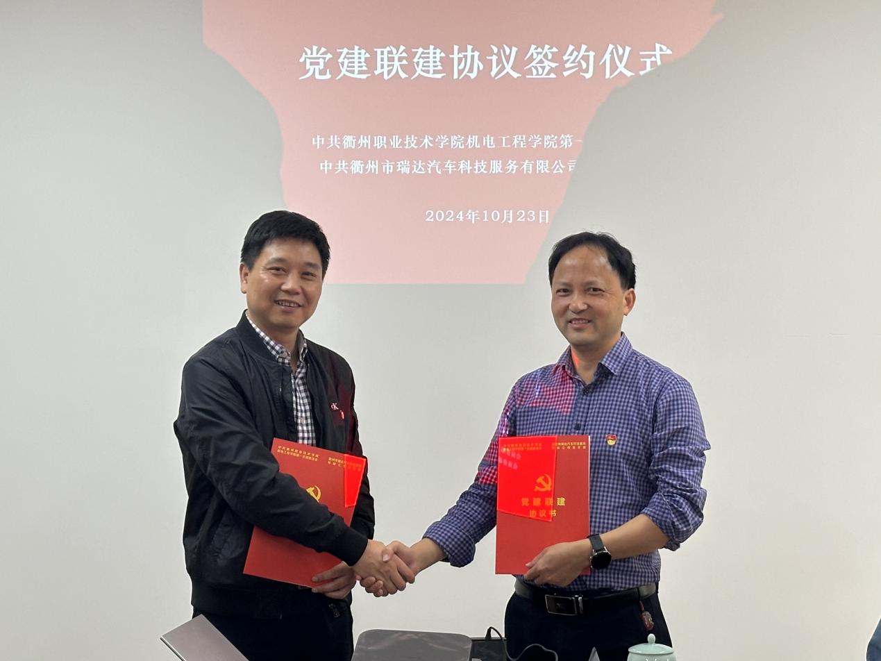 机电工程学院第一党支部书记余富忠与衢州市瑞达汽车科技服务有限公司党支部书记徐小勇签订了党建联建协议书。