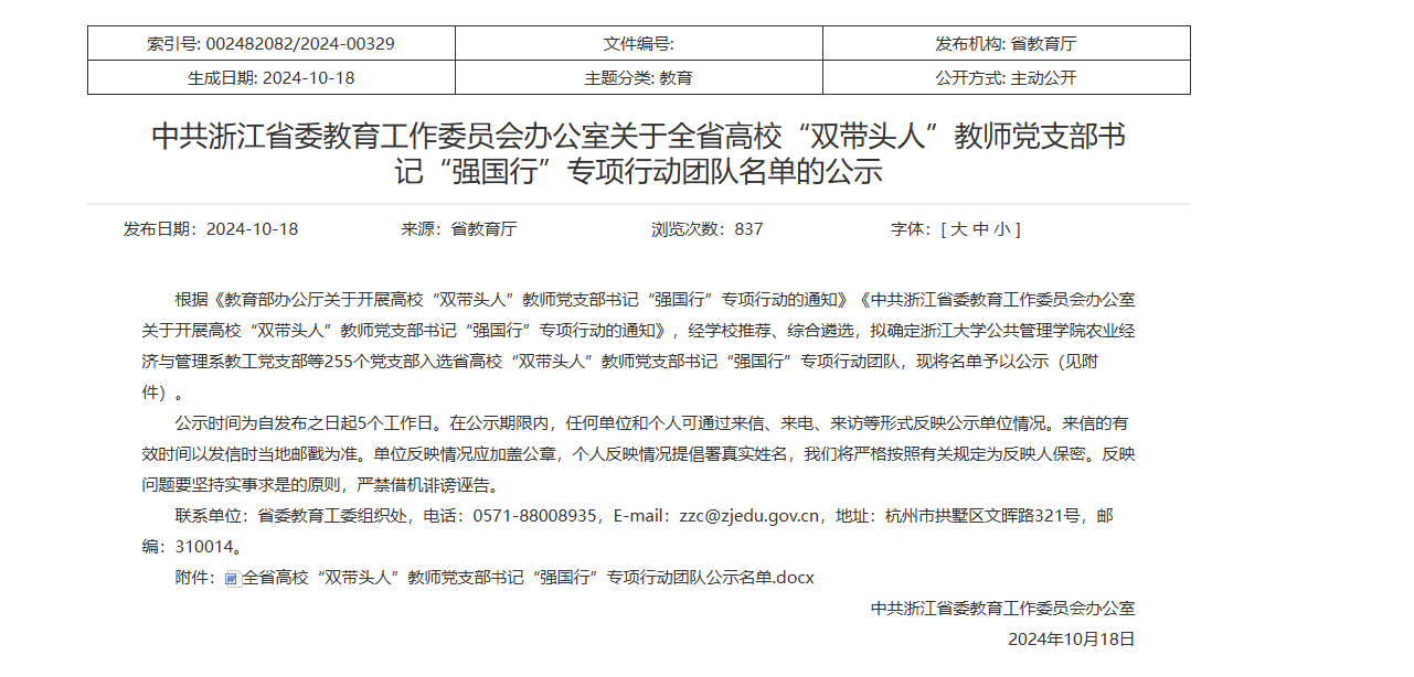 近日,中共浙江省委教育工作委员会办公室对入选全省高校“双带头人”教师党支部书记“强国行”专项行动团队的名单进行了公示,开元网页版经济管理学院第二党支部、医学院第二党支部等2个党支部同时入选。