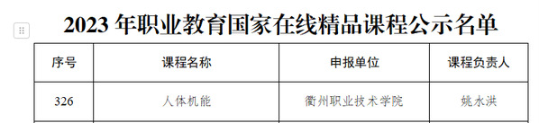 近日,教育部发布“关于2023年职业教育国家在线精品课程遴选结果的公示”,我校姚水洪教授主持的《人体机能》课程成功入选2023年职业教育国家在线精品课程!