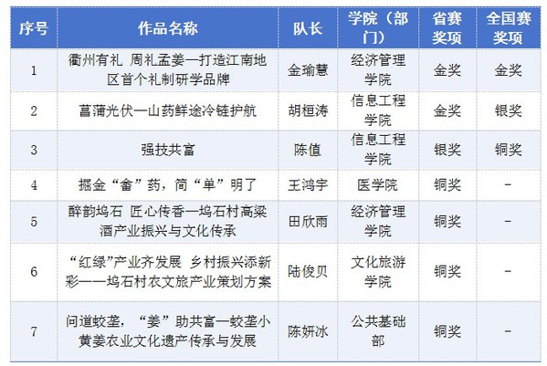 本次大赛是浙江省教育厅、浙江省农业农村厅、浙江省乡村振兴局、浙江省文化和旅游厅、浙江省大学生科技竞赛委员会共同主办的省级A类赛事。大赛共吸引了全省88所高校1563支团队积极参与,经过网络评审和现场答辩,最终评选出金奖157项、银奖234项、铜奖391项。参加全国赛评审,共评选出金奖98项、银奖154项、铜奖240项。