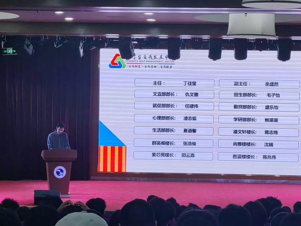 学生部副部长吕欣老师宣布了新一届大学生自我发展中心委员的任命。随后新委员们依次上台,发表了就职演讲,详细阐述了他们未来的工作规划和目标。