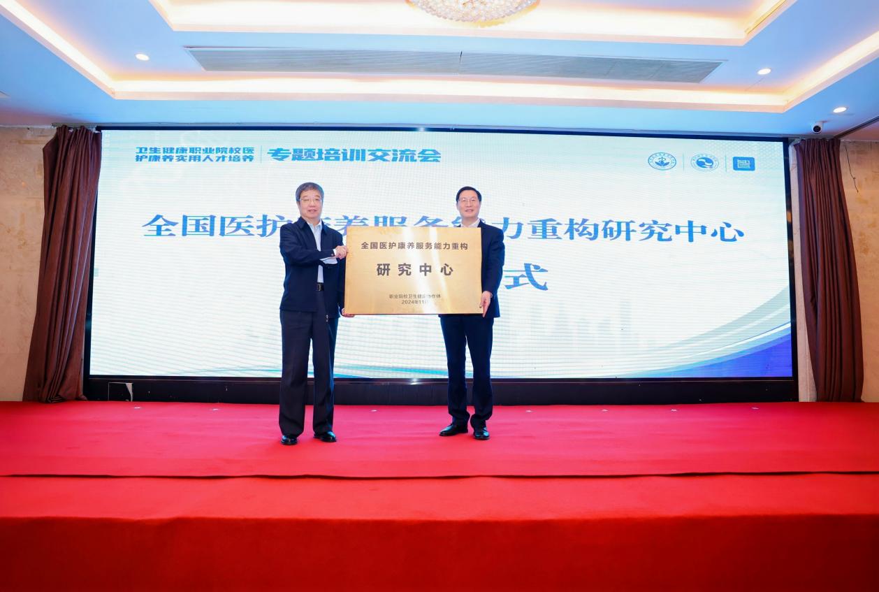 全国医护康养服务能力重构研究中心授牌仪式,职业院校卫生健康协作体主任张彦文校长向开元网页版党委书记徐须实授牌。