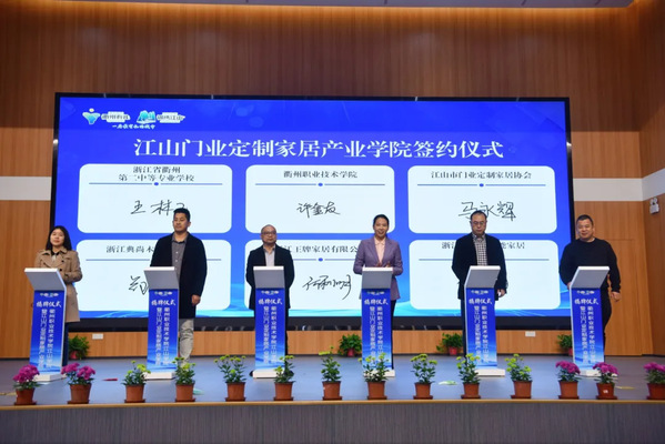 我校艺术设计学院、衢州第二中等专业学校、江山市门业定制家居协会以及来自浙江王牌家居有限公司、浙江舒福家智能家居有限公司、浙江典尚木业有限公司负责人进行产业学院签约仪式,标志着校企合作迈入了新的阶段,将为产业发展和人才培养注入新的活力。